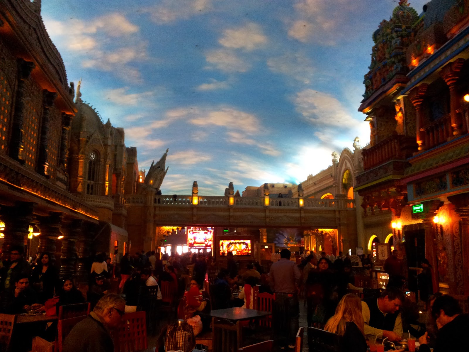 小広場では一定の時間ごとに演奏やダンスなどのパフォーマンスが行われる。始めは退屈したが、陽が落ちるにつれ(屋内は常に青空だが)、出し物の質が上がってきた。圧巻だったのは、20人ほどの男女のダンスパフォーマンス。インドのクラブミュージックは滅茶苦茶格好良く、それに合わせて踊る華麗な民族衣装に包まれたダンサー達のキレは、鳥肌が立つほどハイレベル。周囲はいつの間にか黒山の人だかりで、背後にいた男はよく見ようと、こちらの肩に両手をかけて背伸びする。やめんか。